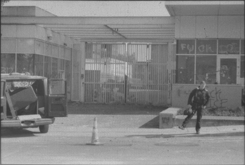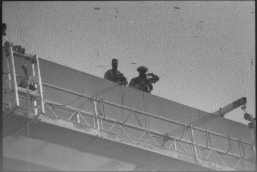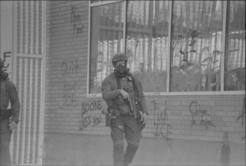 The scene was calm then, only the local cops on the ground and a few DHS or Border Patrol agents on the roof. One on the roof had a paintball gun loaded with pepper balls. I can't tell from the pictures I took, but it looked like the other of the roof pigs, as I called them, had a rifle. An M4 or AR-15. I can’t say for sure, but it wouldn't surprise me. The night before, after the No Kings march died down, a couple hundred people made their way down to the ICE facility. Border Patrol and DHS pulled live firearms on the protestors. Only sidearms, from what I can confirm. But that doesn’t mean they didn’t pull rifles, or that it would make that big of a difference if they didn’t. A live firearm is a live fucking firearm. I was always taught you never point a gun at anything you do not intend to destroy.