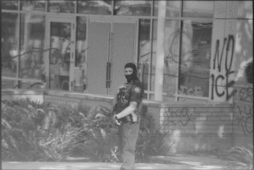 I got to look into the eyes of Border Patrol the day after No Kings. I showed up in plain clothes, with no PRESS nametags adorning me or my camera bag. Based on my experience the day before, I figured this protest would be about the same as the last. It was not so. When I arrived, about four or five cops were milling about. Only one of them was in a balaclava, the one standing outside the ICE facility itself. The others didn't wear any headgear. They looked tired and a little like they would have rather been anywhere else. They stood in contrast to their buddy in the mask; he swaggered around with his thumbs in his belt loops. He looked like he was having a great little time.