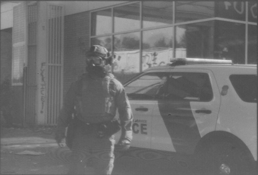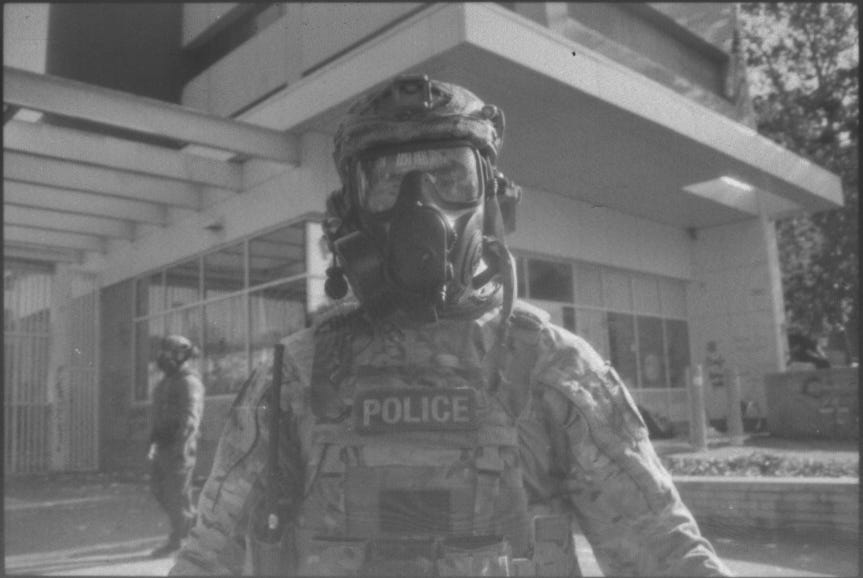 I say soldiers, but not literally–these were a mix of DHS and Border Patrol–but they may as well have been soldiers. They certainly looked the part in plate carriers, full-face gas masks, and desert tactical clothing. The only difference between them and real soldiers is that they were holding paintball guns. Some carried 40mm gas launchers, squat little guns that look like if a submachine gun and one of those tennis ball launchers for dogs had a baby.