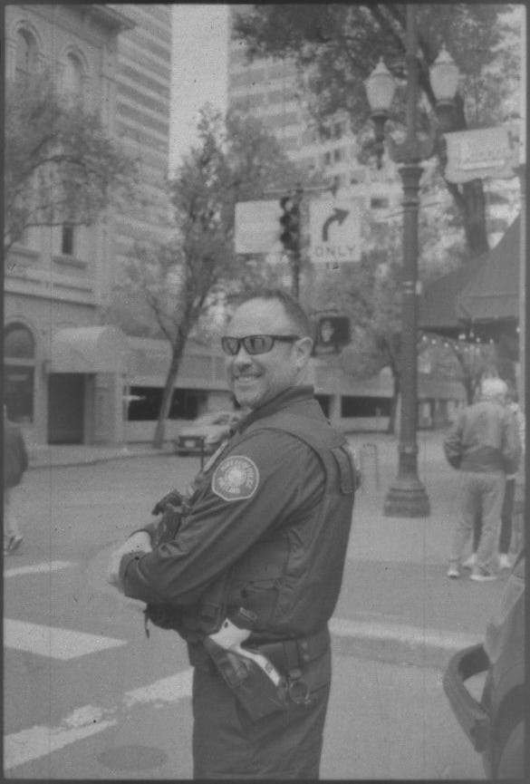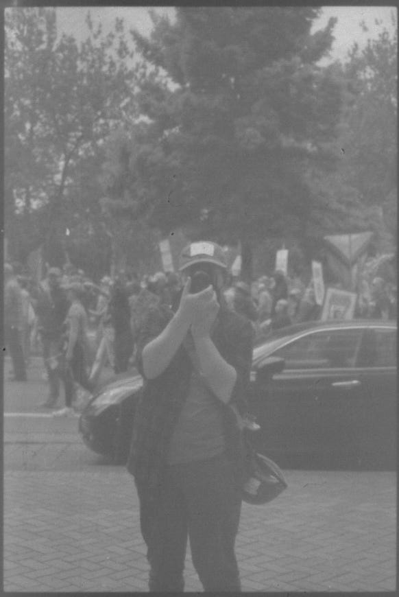 The first protest I ever went to was on June 14th in Portland, Oregon. The No Kings Day march, a worldwide planned event in opposition to Trump with all the proper paperwork filed beforehand. The cops I photographed there gave me the thumbs up and posed with shit eating grins. The next day, I was out front of the ICE detention facility. Those same cops, so jovial the day before, stood in balaclavas and helped ICE and Border Patrol with crowd control. My second ever protest.