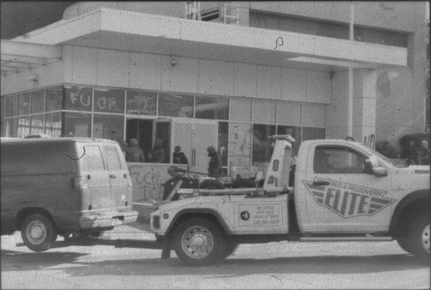 About half an hour later, a tow truck showed up to take the van away. The driver got out of his truck and talked to one of the cops. Then he hooked the van up in a few practiced movements and drove it away. I was over by the encampment after they took the van, getting some supplies I neglected to bring. I didn’t pack my helmet for one, and I’d completely neglected goggles. I did bring my half-face respirator, but without a helmet and goggles, if they tear gassed us, I would just be blind and concussed while breathing a little better, I guess. I grabbed a helmet, donned my gas mask, and put on a pair of kids’ swim goggles. I didn’t even get the chance to take off the Please Remove Protective Film stickers before the gates opened, and soldiers poured out of the breach.